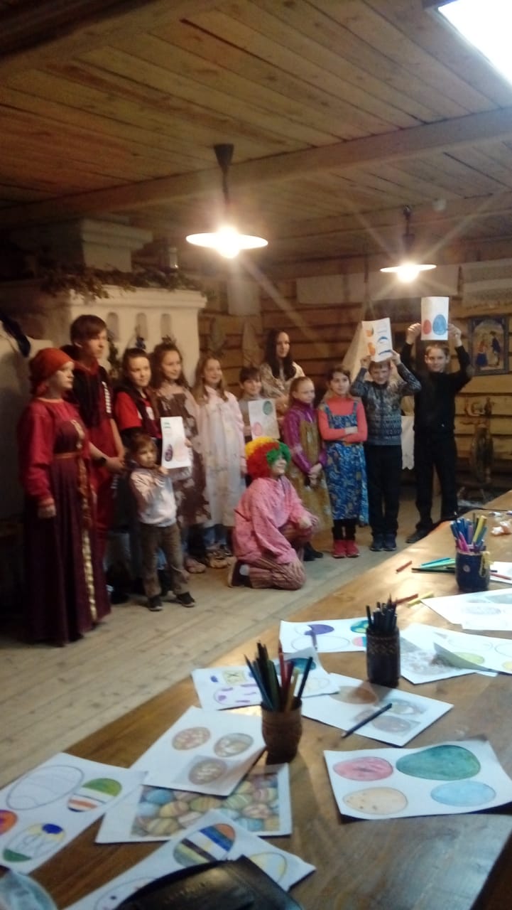 Хозяйка избы познакомила гостей с крестьянским бытом, рассказала о народных традициях наших предков. Напомнила о том, как подготовиться к встрече светлого праздника. Ребята смогли поиграть в русские народные игры, весело водили хоровод, раскрасили картинки с изображением яиц. За участие в конкурсах все получили сладости. В завершении мероприятия дети забрали красочные рисунки в подарок своим близким.
